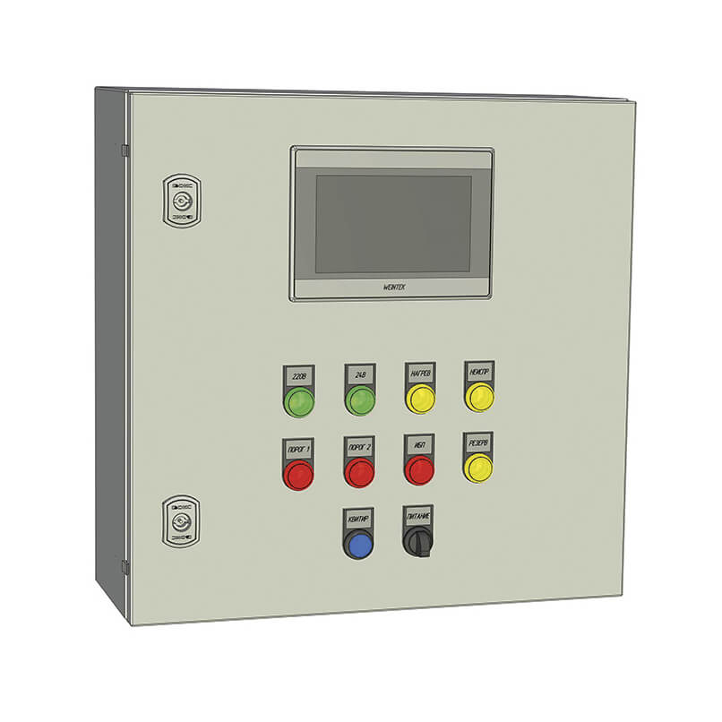 Шкаф ШУГ-Сенсон-С-50_50_20-Э-023 предназначен для сбора данных от газоанализаторов по интерфейсу RS-485 и каналу «Токовая петля 4–20 мА», передачи информации в системы верхнего уровня и визуализации параметров аэрогазовой обстановки. Он позволяет управлять различными исполнительными устройствами промышленной автоматики в зависимости от измеренных концентраций. Для удобного управления шкаф оснащен сенсорной 7″-панелью, а программируемый контроллер ПЛК обеспечивает гибкость настроек и расширенные возможности конфигурации.